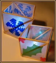 We placed small LED lights inside of our lanterns to light them up. If you wish to hang yours from a tree, hot glue a wire handle to the top. Once you have mastered the little cube, don\'t be shy to try something new. We have used the same techinique to make lanterns that look like a flower, a rubiks cube, a vase, and even a tree topper star. Have fun!